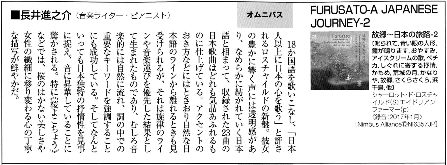 The latest CD from Rothschild, who sings in 18 languages and is said to "sing the soul of Japan better than a Japanese". Her richly resonant voice has a limpid quality, and combined with her Japanese which reels out smoothly, the 23 Japanese songs in the recording are all filled with refinement. Occasionally she can give the impression of varying from the natural Japanese line eg with where she places her stress, but that happens because she gives priority to the line of the melody and the rhythm of the music, and one should rather say that in musical terms the songs flow naturally and she succeeds in stressing the key words in the lyrics.